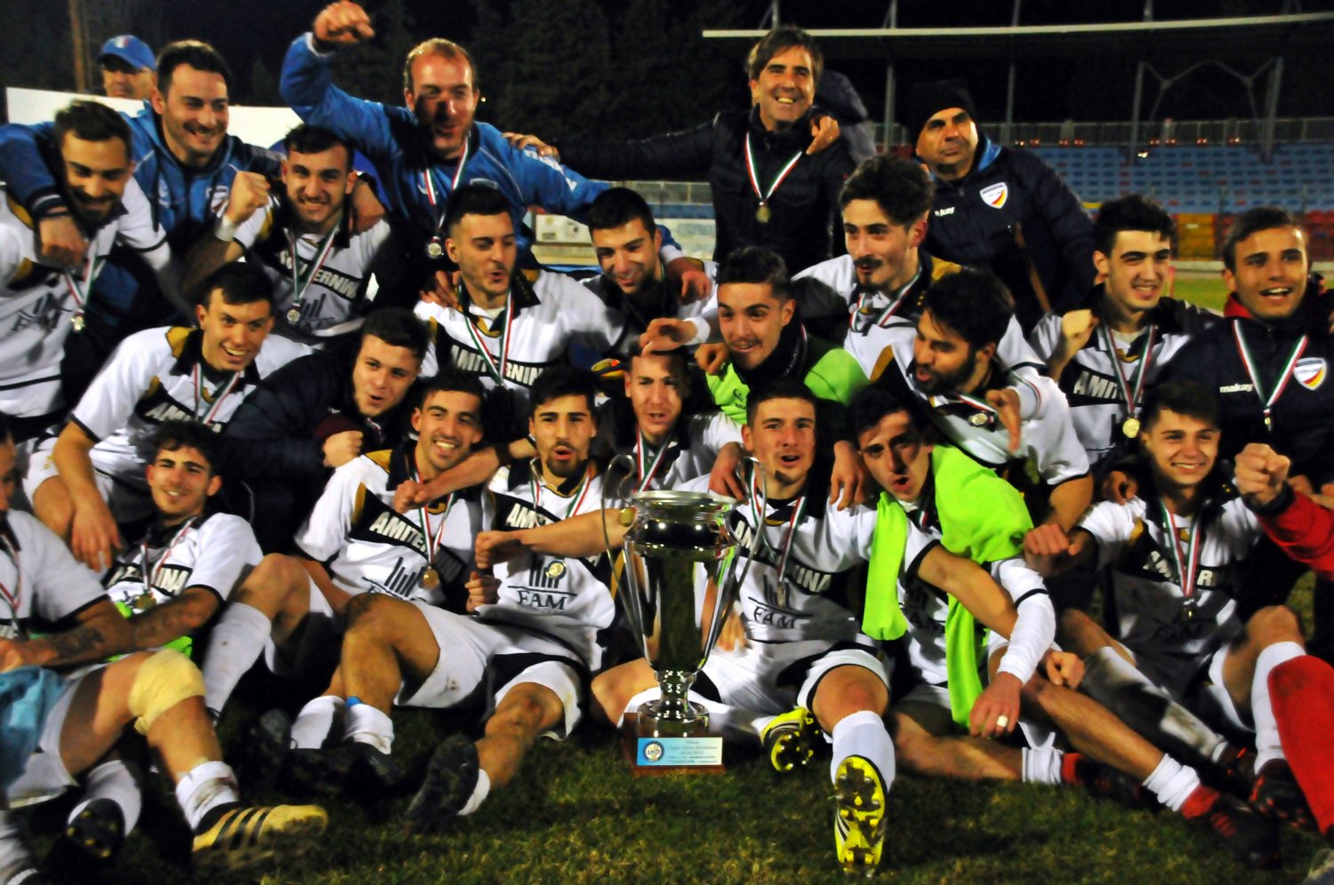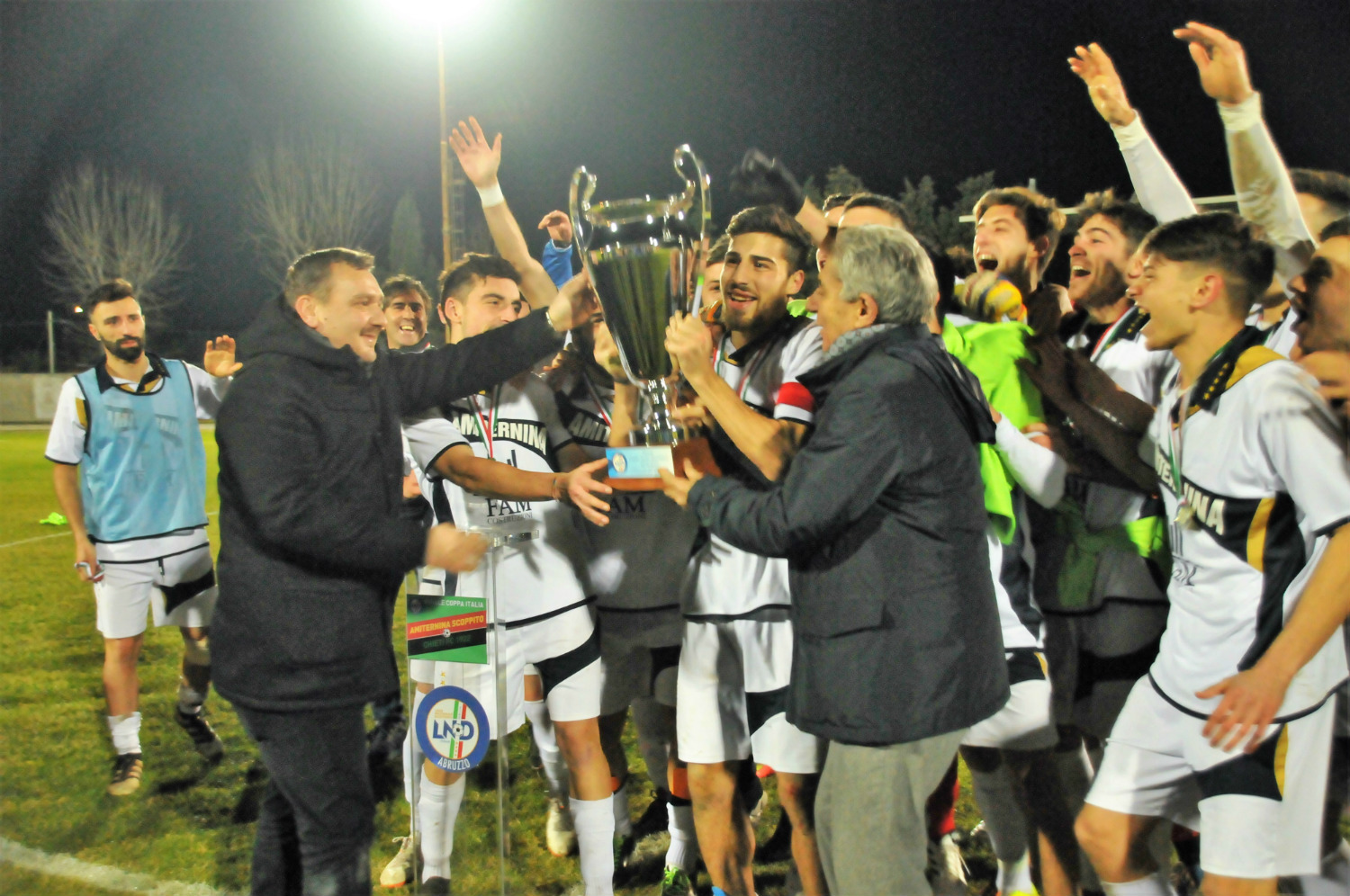 A fine gara la consueta cerimonia di premiazione in campo, con i vertici dell’AIA (Giancola e Pasqua) a premiare la componente arbitrale, il Vice Presidente del C.R. Abruzzo Gianfranco Di Carlo a consegnare le targhe celebrative ai due tecnici e il Vicario del C.R. Abruzzo Ezio Memmo ad omaggiare la squadra seconda classificata. Ultimo atto della bella serata di Silvi è stata la premiazione della squadra campione, coi ragazzi dell’Amiternina Scoppito che hanno fatto esplodere i festeggiamenti dopo aver ricevuto la prestigiosa Coppa dalle mani del Sindaco di Silvi Andrea Scordella e del Presidente del C.R. Abruzzo Daniele Ortolano.