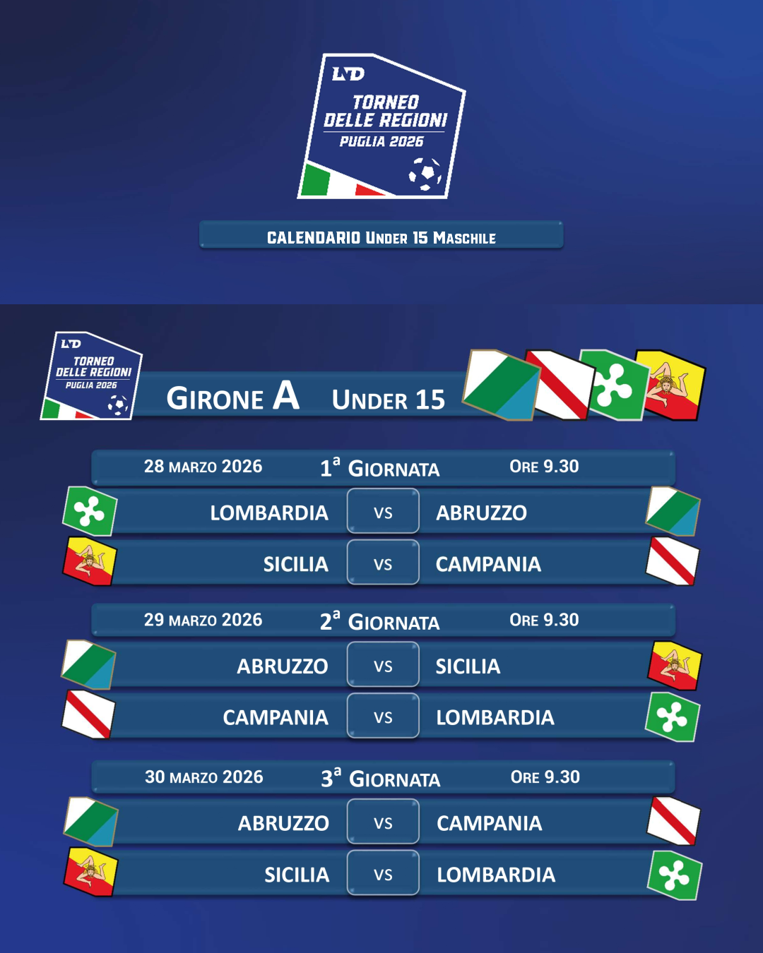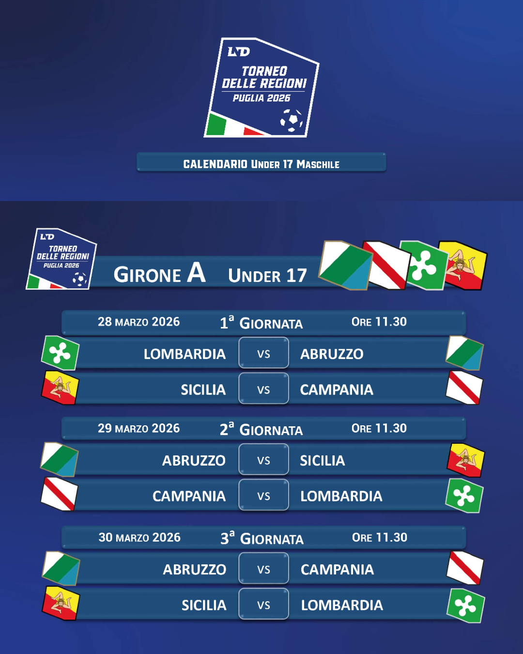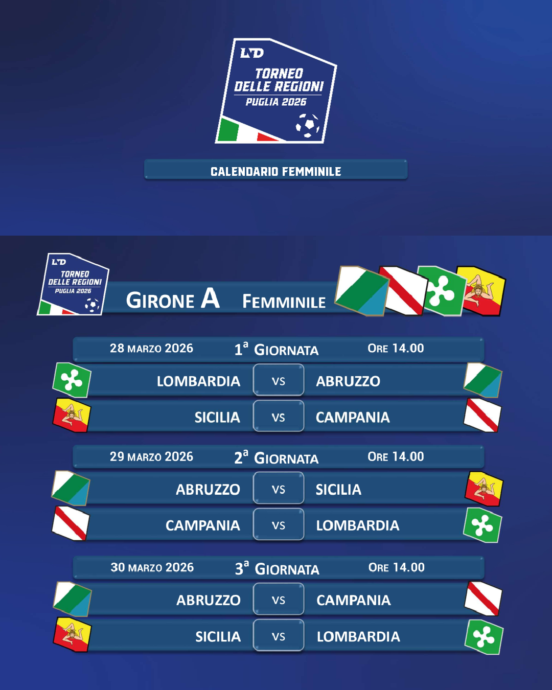 Dal 27 marzo al 3 aprile 2026, quasi 150 gare in 19 impianti tra Bari, Brindisi, Lecce e Taranto: la Puglia sarà il cuore del calcio giovanile italiano. In campo le Rappresentative regionali Under 19, Under 21 Femminile, Under 17 e Under 15. Le squadre abruzzesi giocheranno la prima fase sui campi della provincia barese: Acquaviva delle Fonti, Capurso, Mola di Bari e Conversano.